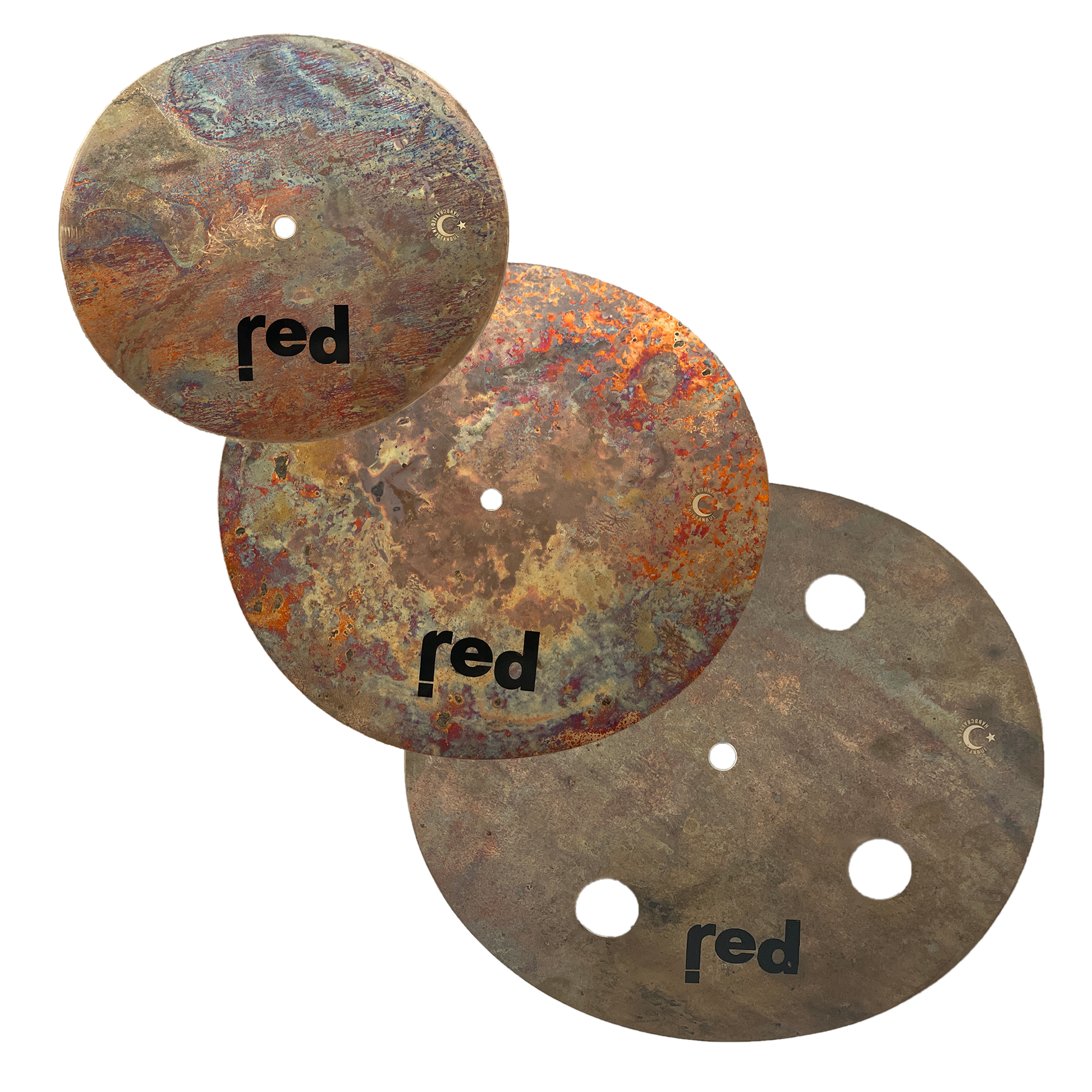 The Red Cymbals Raw Series Triple 8 stack is 3 individual raw B20+ cymbals pieces in various sizes. The pieces are stacked to make a cool sounding clap sound.
